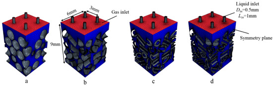 Figure 2. Illustration of four simulated packing meshes including sphere (a), cylinder (b), single-hole cylinder (c), and 4-hole cylinder (d).