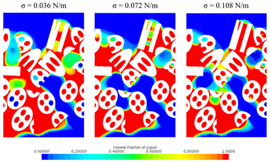 The surface tension force is a tensile force tangential to the interface separating the two fluids. It works to keep the fluid molecules at the free surface in contact with the rest of the fluid and shows remarkable effects on liquid behaviors in TBRs. The surface tension force fσ calculation method named continuum surface force (CSF) model was proposed by Brackbill et al. as the following [27]: