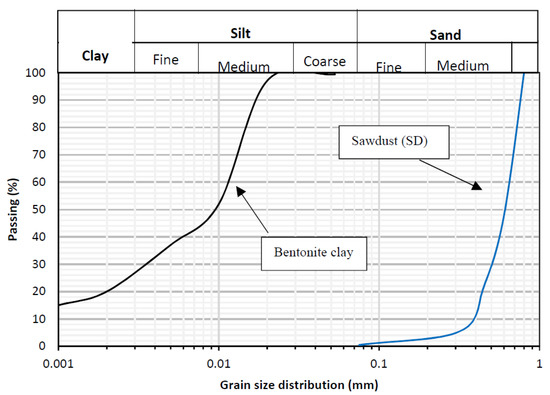 Particle size distribution (PSD) of the used bentonite clay and the used sawdust (SD).