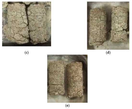 Cured mixture (7 days) of the bentonite-slag-cement (a) 0%, (b) 3%, (c) 5%, (d) 10% and (e) 15% after sulphate attack.