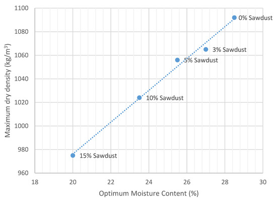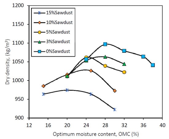 Compaction curves for the used mixtures (i.e., 0%, 3%, 5%, 10% and 15% sawdust).