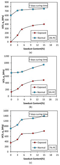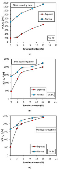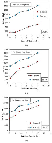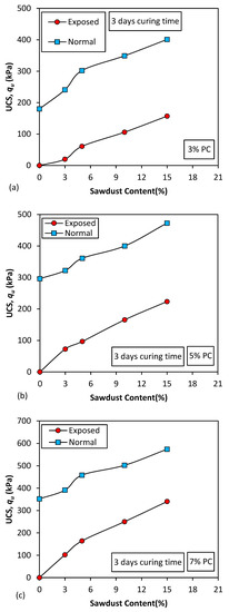 Effect of sawdust addition on Unconfined Compressive Strength (UCS) peak values (3 days curing) (a) 3% PC; (b) 5% PC; (c) 7% PC.