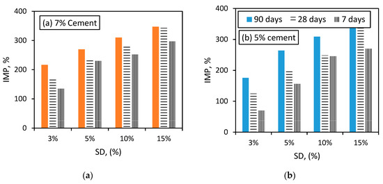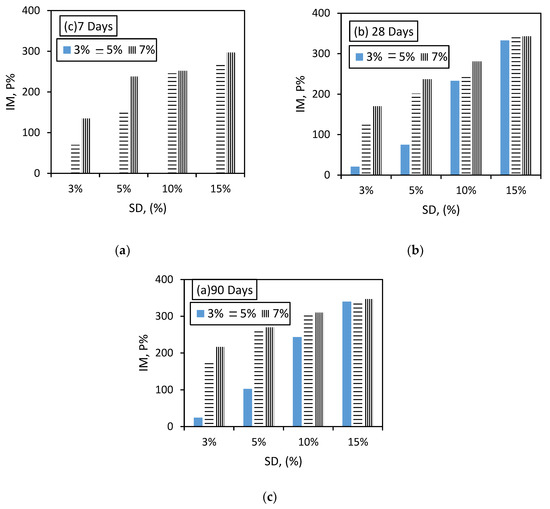 Effect of sawdust addition on IMP values after exposure to sulphate: (a) 90 days curing; (b) 28 days curing; (c) 7 days curing.