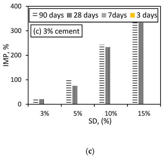 Effect of cement addition on IMP values after exposure to sulphate: (a) 7% cement; (b) 5% cement; (c) 3% cement.