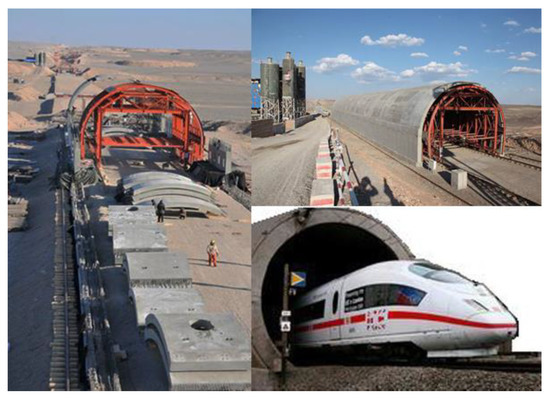 The flow field around a vehicle usually varies transiently when vehicles move from one infrastructure scenario to another, depending on the infrastructure scenarios, such as flat grounds [1,2,3,4], embankments [1,5,6], and viaducts [7,8,9], thereby resulting in the transient variation of aerodynamic force on a vehicle and even a serious overturn accident. For example, an overturn accident occurred in China’s Lanzhou–Xinjiang Railway in 2007, which might be attributed to the transient variation of aerodynamic force when the train was entering wind barriers from open air [10,11,12,13,14]. The transient variation effect is likely to be serious when vehicles are driven into the tunnel from a crosswind environment because the tunnel has more considerable space closure than other infrastructure scenarios. In addition, entering/exiting a tunnel is becoming a common operation environment of a high-speed trains (HSTs), especially in China where an increasing number of cut-and-cover tunnels are designed as a windshield facility of a windy area (Figure 1).