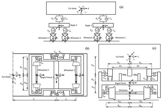 where , , and are the distance between the gravity center of the carriage body and the upper suspension, upper suspension and the bogie, and bogie and the wheelsets, respectively; and are the half width of the wheelbase and length of carriage, respectively; and are the half lateral width of the upper and lower suspensions, respectively; and , , , and , and and are the elasticity coefficients of the upper and lower suspensions in the three directions, respectively.