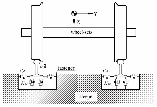 The ballastless track is widely used in high-speed railway (HSR). The rail is fixed in the sleeper via a fastener, which is simulated using springs and damps (see Figure 3). The sleeper is assumed to be fully restrained. The matrix equation of the rail is identical with Equation (1) in form [31].