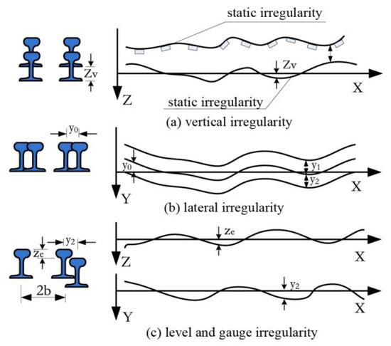 Figure 4 shows the schematic diagram of track irregularity. The power spectrum density (PSD) is widely used to describe track irregularities and is expressed as follows [31,32]: