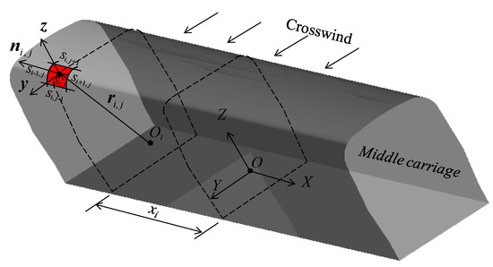 The aerodynamic forces and moments (i.e., side and lift forces and rolling, pitching, and yawing moments) are defined in Equation (27). Here, the center of the moment is the barycenter of the carriage body, as shown in Figure 5 (take the middle carriage as an example).