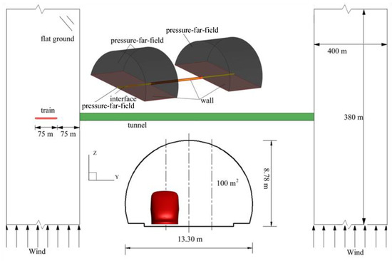 For boundary conditions, the atmospheric boundaries outside the tunnel (including entrance and exit) were applied by a pressure-far-field. Crosswinds were set at the pressure-far-field boundaries. The crosswind velocity direction was perpendicular to the running direction of the HST. A non-slip wall was applied to the flat ground, train, tunnel surfaces, and two ends of the tunnel (see Figure 6).