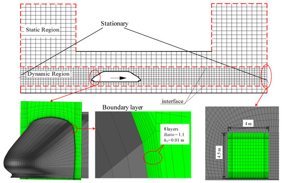 The whole computational zone was divided into static and dynamic regions by structural hexahedral grids (see Figure 7). The relative motion between the train and flat ground was realized by the Layering dynamic mesh method [8,10,12,13]. Data transmission between the static and dynamic regions was implemented by an interface. Through the grid sensitivity analysis described in Section 4.3.3, it was finally determined that the total number of model grid cells was 9.5 million and the number of boundary layers on the train surface was 8.