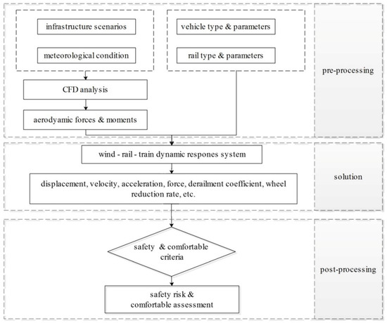 A self-developed program called the wind–train–rail structure (WTRSDYNA) was used to perform a case study [8,10,31]. The time-step size of the program solution was determined to be 2 × 10−4 s. The dynamic responses (i.e., acceleration, velocity, and displacement of train and wheel), wheel–rail contact force, safety coefficients (i.e., DC and WRR), and other dynamic responses of carriages were all obtained from WTRSDYNA. Figure 8 shows the outline of the WTRSDYNA coupling solution.