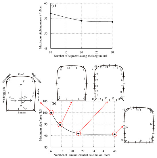 The target indicators under different conditions: (a) different numbers of longitudinal segments; (b) different numbers of circumferential calculation faces (train speed = 250 km/h; wind velocity = 25 m/s).