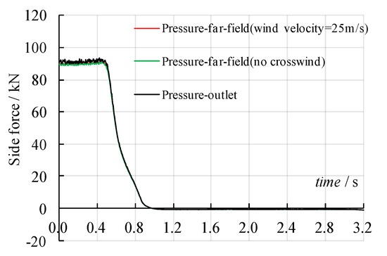 To check the influence of boundary conditions at the tunnel exit on the calculation results in present study, the atmospheric boundary at the tunnel exit was set as three conditions, i.e., the pressure-far-field boundary (crosswind velocity = 25 m/s), the pressure-far-field boundary (no crosswind), and the pressure-outlet boundary. The time-history data of the side force of the head carriage during the train entering tunnel was taken as the target indicator. The atmospheric boundary conditions at the tunnel entrance remained unchanged ([pressure-far-field boundary with 25 m/s crosswind) and the train speed was maintained at 250 km/h in three cases. It is shown from Figure 10 that the target indicator was basically not affected by the atmospheric boundary conditions at the exit.