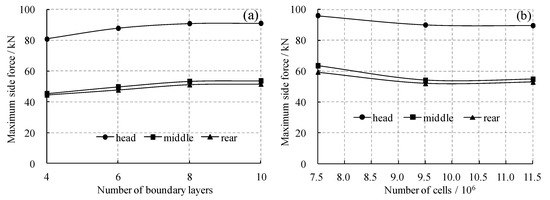 In this section, the mesh sensitivity of the present model is checked from two aspects, i.e., the number of boundary layers and grid elements. The target indicators are the maximum side force of the head, middle, and rear carriages during the train running on flat ground under crosswind. First, the calculation results of four models with different numbers of boundary layers are compared, as shown in Figure 11a. In each case, the height of the first layer and the entire boundary layer remained constant (see Figure 7). The crosswind velocity and the train speed remained at 25 m/s and 250 km/h, respectively. It can be seen from Figure 11a that the target indicators remained constant when the number of boundary layers increased to 8. The number of grid elements of the whole model wad then set to 7.5, 9.5, and 11.5 million, as shown in Figure 11b. The number of boundary layers for each model remained at 8. As indicated in Figure 11b, the target indicators tended to stabilize when the number of cells increased to 9.5 × 106. Therefore, it can be considered that the scheme of grid size adopted in the present study is reasonable.