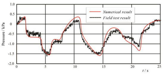 The transient pressure calculated by the present numerical algorithm was compared with that obtained by the corresponding field test [36,37] to verify the accuracy of the adopted algorithm in this simulation. The length and clearance area of the test tunnel were 1320 m and 60 m2, respectively. A ground–tunnel–ground numerical model with the same tunnel was established to ensure the validity of the verification (Figure 12). The geometric shapes of the train (CRH3) and tunnel in the numerical model were consistent with the field test prototypes. The train speed in this test was approximately 200 km/h, and wind velocity (Vw) was ignored. The monitoring point was located on the outside of the front side window on the head carriage. Figure 13 shows the comparison of the time-history data between the numerical simulation and field test. The waveform shows a remarkable correlation between the two, except for minimal asynchronous time.