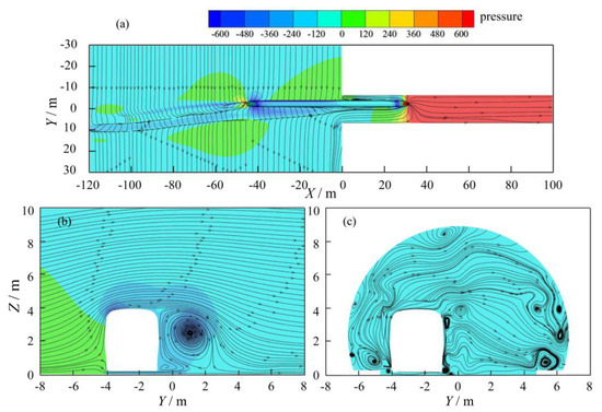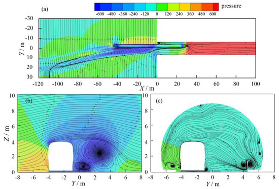 Pressure and flow distribution for train speed = 250 km/h, crosswind velocity = 25 m/s, (a) z = 1.55 m from top of rail, (b) 10 m outside tunnel entrance, and (c) 10 m inside tunnel entrance.