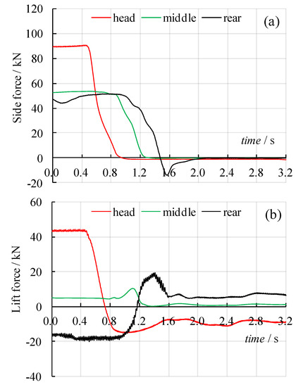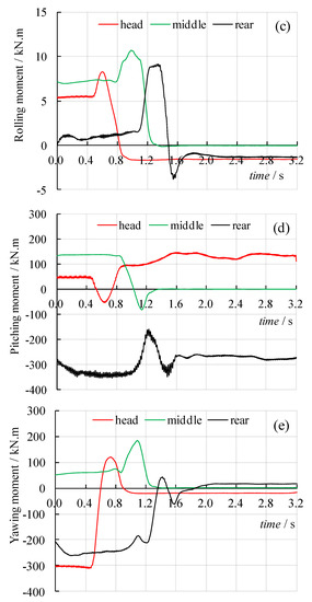 Figure 16a–e show the time-histories of the five aerodynamic loads (i.e., side, lift forces, and rolling and pitching and yawing moments, respectively) during the train entering the tunnel under conditions of train speed = 250 km/h and crosswind velocity = 25 m/s. The red, green, and black lines represent the head, middle, and rear carriages, respectively.