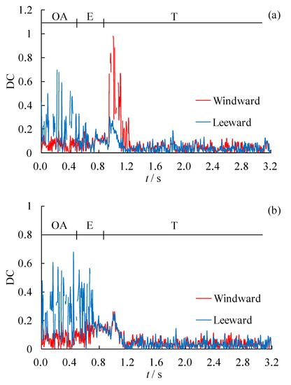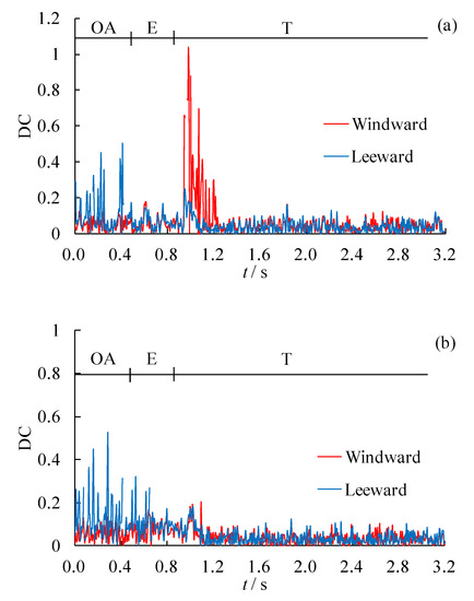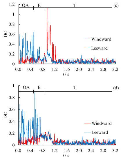 Figure 17a shows that the global maximum of the DCs is likely to happen when the train arrives at the tunnel entrance. When the time was less than approximately 0.5 s, the entire carriage ran in the open air, the train withstood the side force from the crosswind, and the rail in the leeward side was pressed by the edge of the wheel. This phenomenon is the reason why the DCs on the leeward side were larger and easier to fluctuate than those on the other side. Therefore, the maximum DC on the leeward and windward sides was 0.56 and 0.15, respectively. When the carriage had completely entered the tunnel, the side force in the windward suddenly revoked at this moment (approximately 1.1 s), thereby causing the sudden reverse rotation of the carriage around the longitudinal axis. The vertical contact force of the wheel in the windward side suddenly increased, thereby shocking the DCs in the windward side upwards. The shielding effects of the aerodynamic loads induced by the tunnel was intensely sudden, such that the global maximum of the DCs was presented (e.g., approximately 1.04 for the first wheelset, nearly 2 times than the maximum DCs in the open air). Finally, the DCs at both sides decreased to less than 0.2 when the carriage entered the tunnel (after 1.1 s).