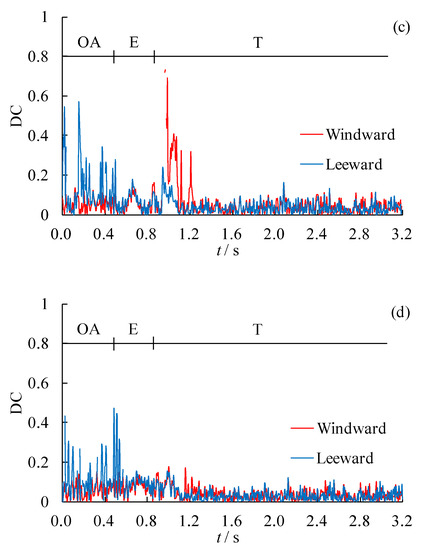 It can be seen from Figure 19 that the maximum DC value of the rear carriage characterized similarly to that of the head carriage. At the third wheel in the windward side of rear carriage, the DC was approximately 0.17 and 0.93 when this carriage ran in open air and in the process of entry, respectively. The DC of the third wheel for the windward side of rear carriage was larger than the others when entering the tunnel. The global maximum of DCs was slightly less than that of the head carriage. The reason for this phenomenon may have been that the aerodynamic loads of the rear carriage were slightly lower than those of the head carriage (Figure 16). No significant difference of DCs was observed amongst the four wheelsets of the middle carriage when running in the crosswind environment completely. The maximum DC (0.69) of the middle carriage when it entered the tunnel was the minimum among the three carriages (Figure 19b).