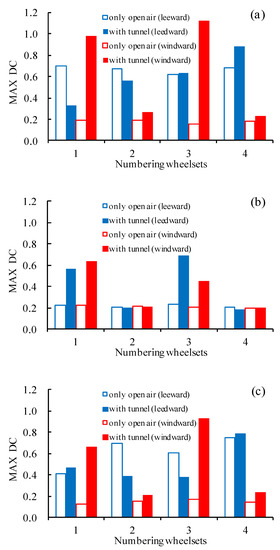 Figure 19 presents the comparison of all wheels’ maximum DC values amongst the head, middle, and rear carriages during the two processes (i.e., only in open air and entering tunnel) under conditions of train speed = 250 km/h and crosswind velocity = 25 m/s to discuss the influence of the aerodynamic variation on the train running safety.