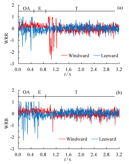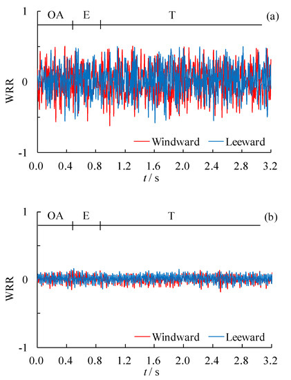 To verify the effectiveness of the track irregularity spectrum used in the present study, Figure 22 shows the time-history of the WRR in the first wheelset of the head carriage during the train entering the tunnel at a speed of 250 km/h (no crosswind) under the track spectrum condition in this paper and the corresponding result under the condition of the Chinese track spectrum [40], respectively. It is shown from Figure 22 that the WRRs of wheels on both sides fluctuated at the same level due to the absence of crosswind. The maximum WRR value, shown in Figure 22a,b, was 0.51 and 0.17, respectively. Both were significantly smaller than the corresponding result shown in Figure 20a. Therefore, the track irregularity spectrum adopted in the present study is effective and conservative.