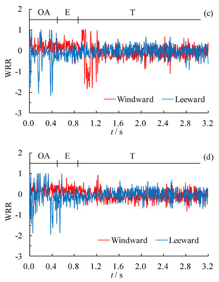 Figure 20a–d shows that the carriage deflected to the leeward side, the vertical contact force decreased in the windward side, and WRR stabilized at a higher level in the windward side when the train ran in the crosswind environment completely. Meanwhile, the variation amplitude of the WRR in leeward side wheel was remarkably larger than that of the opposite side because the wheel tread on the leeward side had close contact with the rail top. When the train was in the process of entry, the carriage turned aside towards the windward side due to the sudden disappearance of wind excitation. As shown in Figure 20a, the WRR in the windward side decreased to −2.63 (the lowest value among the four wheelsets), whereas that in the leeward side increased to 0.64 instantaneously because of self-weight. Then, the WRR in the windward side rose to its global maximum of 1.0, indicating that the wheel had been detached from the rail. Finally, the WRRs on both sides rapidly decreased when the train entered the tunnel due to the buffering effect of the suspension system.
