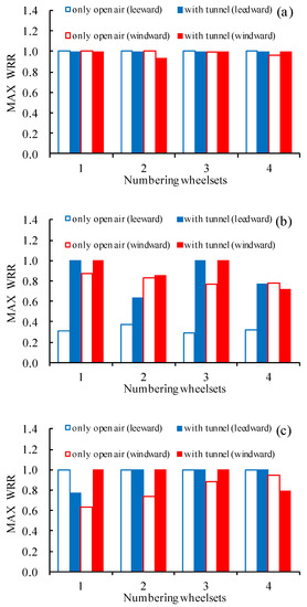 Similar to DC, the variation amplitude of WRR of the first and third wheels in the windward side was larger than those of the other wheels and occurred instantaneously when the train entered tunnel. Figure 21 presents the comparison of all the wheels’ maximum WRR values amongst the head, middle and rear carriages during the two processes (i.e., only in open air and entering tunnel) under conditions of train speed = 250 km/h and crosswind velocity = 25 m/s. A safety risk was likely to be observed in the head carriage based on the discussion of the DCs and WRRs.