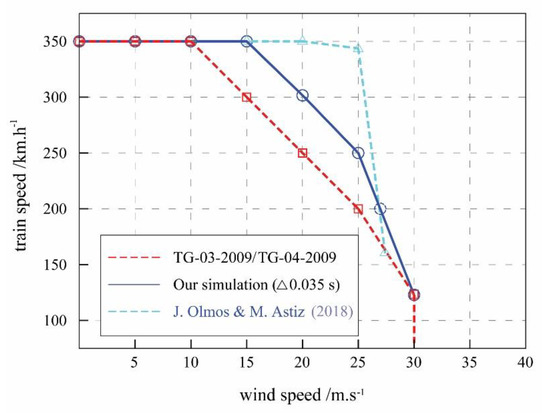 Figure 24 presents the CWCs or the wind speed against the train speed for applications based on the safety criteria, where the wind speed had a constant velocity. The allowable speed of Chinese regulations [42,43] when crosswind is involved and the results of other studies found in the scientific literature [44] are presented for comparison. The present investigation shows that in terms of safety, an HST can enter a tunnel with crosswind at 350 km/h when the crosswind velocity is less than 15 m/s, which is looser than the national regulations but more conservative than that of Olmos et al. [44]. The literature results are deduced from the wind–train–viaduct interaction. The CWC comparison implies that the transient wind effect at the tunnel entrance might not be neglected.