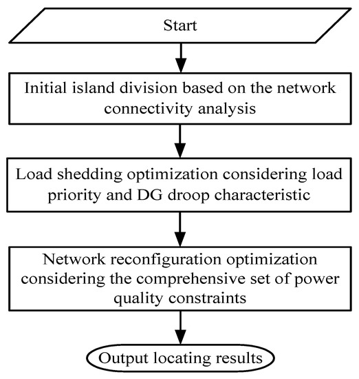 - In the network reconfiguration optimization model, the comprehensive set of power-quality constraints is considered so the obtained recovery scheme of the island can achieve good power-quality indexes. By this way, the threats caused by power-quality issues, such as high node voltage total harmonic distortion and excessive negative sequence current, can be prevented to guarantee the safe operation of the obtained island. Concrete illustrations of the load-shedding optimization model are proposed in Section 4.