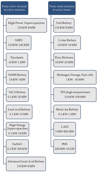 The key to addressing the variability and uncertainty of VRE integration is the increasing of the overall flexibility in the power systems. Energy storage technologies can provide a variety of flexibility services, including the provision of operating reserves and shifting energy over time to better match generation and load [,,,,,,,]. This technology can provide both downward and upward flexibility, storing energy either when there is a generation surplus or lower demand and discharging in the opposite case [,,,]. With respect to solutions for the load balancing of demand and supply in the electricity system large-scale storage options, such as molten-salt thermal storage, pumped hydro storage (PHS), battery, flywheel, or compressed air storage systems are of main interest (Figure 2) [,,,,]. However, the specific details of the features of these energy storage technologies are not included in this manuscript.
