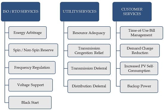 The Rocky Mountain Institute has summarized several battery energy storage services based on reports, expert interviews, and internal analysis. This work described 13 energy storage services by the stakeholder groups: independent system operators (ISOs)/regional transmission organizations (RTOs), utilities, and customers. Energy storage can be classified at three different levels: behind the meter, distribution, or transmission level (Figure 3) [].