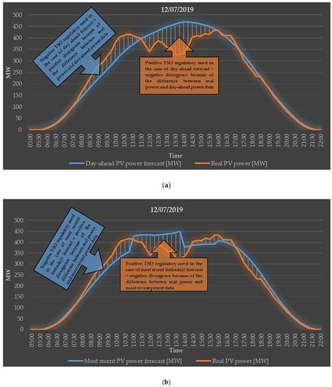 In this manuscript, a 0% divergence limit was analyzed with 15-min frequency measurement periods. This model approach fits the “Transmission Congestion Relief” [] utility services category. For example, today in Hungary, PV system operators need to create 15-min-based PV day-ahead electricity production forecasts for every single day for the Hungarian TSO []. Intraday PV forecasts are optional. However, it should be noted that PV system owners need to pay a kWh-based surcharge for any intervals of 15 min if the divergence is more than ±50% between measurements and forecasts from 1 July 2018. For this reason, creating intraday PV forecasts is highly recommended, because it can reduce the rate of the surcharge [,,,]. According to the new regulatory model, the ±50% divergence limit will be 0% within a few years due to the rapid growth of PV systems [,,,]. This is because when the real energy output of the PV system in the 15-min time interval does not reach the day-ahead or intraday forecast, then officially the TSO needs to regulate in a positive direction []. From the perspective of the PV system operators, this means that the positive TSO regulation equals a negative divergence because of the difference between real power and day-ahead or the most recent power data, which is caused by the official calculation method. This logic (Figure 4) was illustrated by real data of 12/07/2019. This European market example shows that tightening the legal framework for PV forecasting accuracy in the day-ahead and intraday market can make investors economically interested in using energy storage systems to achieve more accurate daily energy generation by PV.