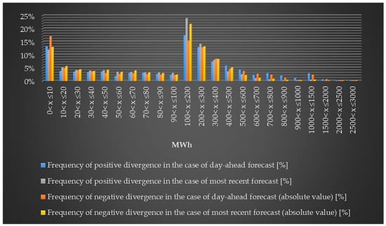 In addition, the results showed that the most recent forecast reduced the MWh regulation size of the daily positive divergence above 10 MWh compared to the day-ahead data. In the negative case, this effect occurred only above 60 MWh. In the case of the 100 < x ≤ 200 MWh range, the best forecast resulted in a 6.4%–6.5% improvement in regulation compared to the day-ahead one. The examination of the negative divergence showed that there were rare cases (0.05%) where 2500 MWh < x ≤ 3000 MWh deviations had to be regulated daily. The most common categories for regulation were the 0 MWh < x ≤ 10 MWh and the 100 MWh < x ≤ 500 MWh, because they accounted for 62% of the positive and 61% of the negative divergences, respectively (Table 5, Figure 6).