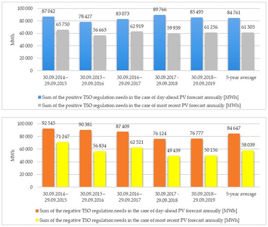 The summarized results of the positive and negative TSO regulation needs based on the day-ahead and most recent PV energy forecasts in the case of a 1000 MWp PV system for the period of 30/09/2014–30/09/2019.