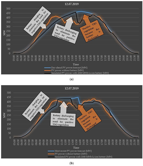 To understand the results of the simulations, the day of 12/07/2019 was separately simulated and the battery charge level started from 0% in this case (Figure 8). In the example, the black line represents the simulated PV power with a 1000 MWh Li-ion battery, and the goal was to try to keep the day-ahead or the most recent (intraday) PV forecast. In the case of a positive divergence (from the perspective of the PV system operators), because of the difference between the PV power without battery and the forecasted power data, the energy storage had been charged with this difference. Battery discharging happened to eliminate the need for positive TSO regulation. In the case of a discharged (or fully charged) battery, the balancing energy was provided by the grid (Figure 8).