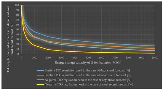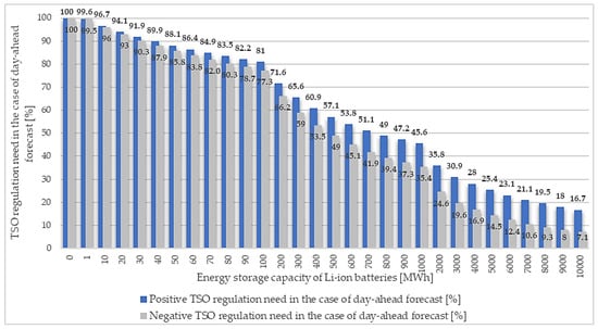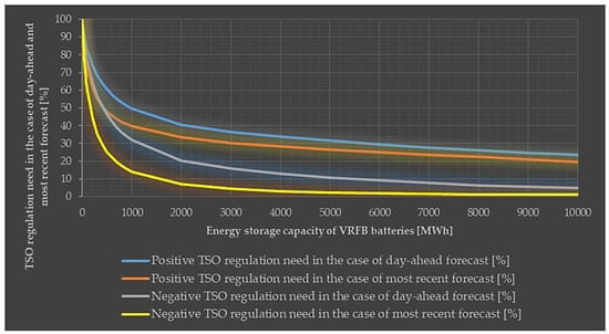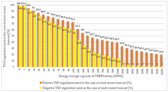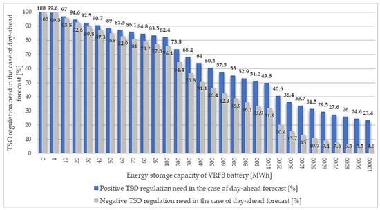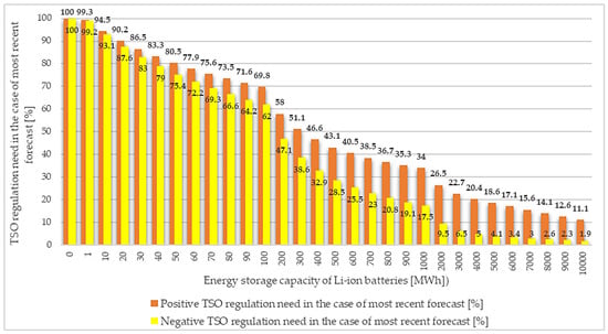In Figure 9, Figure 10, Figure 11, Figure 12, Figure 13 and Figure 14, the negative and positive TSO regulation needs in the case of day-ahead and most recent forecasts with different Li-ion and VRFB energy storage capacities related to a 1000 MWp PV system were summarized for the period of 30/09/2014–30/09/2019. These results were determined from the 5-year average values of TSO regulations and battery usage. In Figure 9, Figure 10, Figure 11, Figure 12, Figure 13 and Figure 14, 100% data meant the situation without the battery. The 100% average TSO regulation values in MWh are contained in Figure 7 presented above. In the simulations, the batteries were charged only by PV power when positive power divergence occurred (from the perspective of the PV system operators). The results showed that the battery was more effective in negative TSO regulation need than in the positive case. The main reason for that was the energy storage round-trip efficiency phenomenon (Figure 13 and Figure 14) and to a lesser extent the characteristics of the battery charge status. The latter case is important because e.g., it is not possible to cover the negative TSO regulation requirement with a fully charged battery. The round-trip efficiency effect was more visible in the case of the VRFB technology. For this type of battery, the response to negative TSO regulation need was a few percent more efficient because of the higher charging loss compared to the Li-ion one. In the case of the most recent forecast, a 1 MWp PV system with an >8000 MWh VRFB battery eliminated 99% of the negative TSO regulation requirement (Figure 12), whereas this characteristic was 0.9% to 1.6% worse (Figure 11) for the Li-ion battery. In contrast, the positive TSO situation was more difficult to regulate with the VRFB technology.