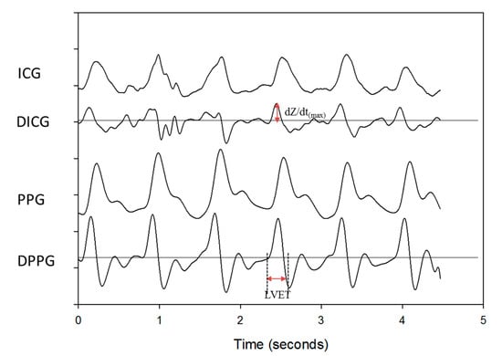 Four signals include impedance cardiography (ICG), differential ICG, photoplethysmography (PPG), and differential PPG. The left ventricular ejection time (LVET) is defined from the differential PPG signal.