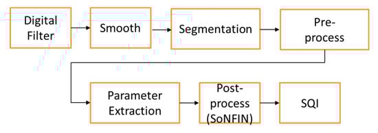 In the study, an SQI algorithm was developed to find out whether a PPG pulse was high quality or not. The flowchart of the proposed algorithm consists of several process steps, including the digital filtering, the Gaussian filtering, the segmentation, the pre-process, the parameter extraction, the post-process, and the SQI calculation, as shown in Figure 2. Our designed ICG device was described in reference [], in which analog ICG and PPG signals all were digitalized with a 500 Hz sampling frequency. The PPG signal would be filtered to remove the wandering noise of the baseline and the high-frequency noise using a second-order Butterworth bandpass filter in which the lower and upper cutoff frequencies were 0.2 Hz and 10 Hz, respectively. A Gaussian filter was adopted smoothing the PPG signal. The smoothed PPG signal without the motion artifact is similar to a sinusoidal signal. Thus, we segmented the PPG pulse according to the sinusoidal signal. The rigorously corrupted PPG pulses would be detected and deleted in the pre-process procedure. Four parameters were extracted from the smoothed PPG pulse, which were used to determine the level of SQI for each PPG pulse with the SoNFIN algorithm. The levels were high, middle, and low.