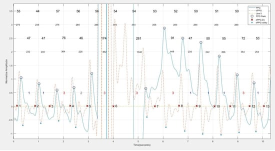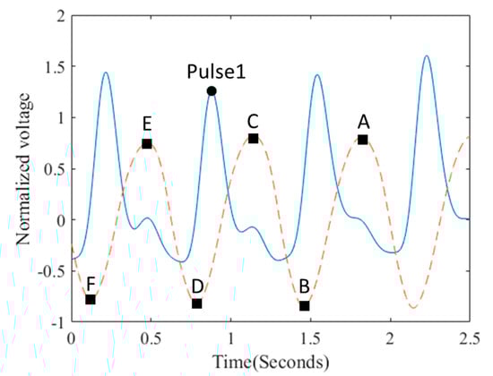 where n is between –(L − 1)/2 and (L − 1)/2, σ is (L − 1)/2α, L is the width of the curve, and α is the regulating factor. In our study, L is 450 points and α is 2.5. From the smoothed PPG signal, the maximum peak and minima valley of the PPG pulse could be found at the duration between D and B points, as shown in Figure 3. Then, a PPG pulse was segmented.