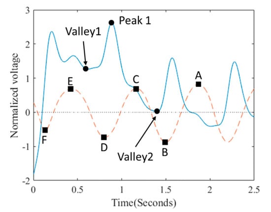 The PPG pulses were segmented from the smoothed PPG signal according to the previous mentioned procedure. However, the Gaussian filter cannot be affected by the wandering noise. In Figure 4, the PPG signal (solid line) is corrupted by the wandering noise, but its smoothed signal (dashed line) is same as the smoothed PPG signal without the wandering noise. Therefore, in the pre-process, the segmented pulses must be verified regarding whether their baselines were corrupted by the wandering noise or not. If the PPG pulse is corrupted by the wandering noise, it will be deleted. As shown in Figure 4, when the peak and two side valleys of a PPG pulse have the same signs, or the two side valleys have different signs, this PPG pulse is considered to be owning severe wandering noise, and it is deleted.