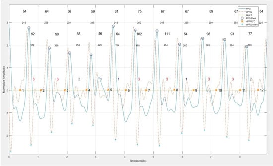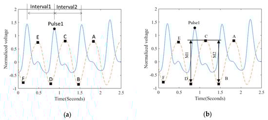 where M1 is the magnitude between the levels C and D, and M2 is the magnitude between the levels C and E for the smoothed PPG signal, as shown in Figure 5b.
