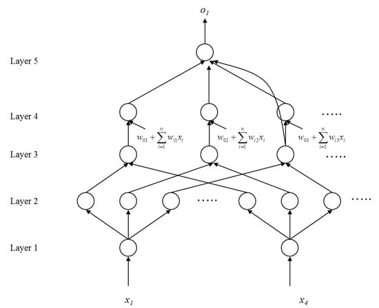 where xi is the input variable, yj is the output variable, Aij is a fuzzy set, and is the traditional TSK model. The five layers are described in detail as follows.