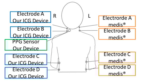 The measurement duration for each subject lasted for three minutes. During the measurement, four electrodes of medis® CS2000 were placed at the left side of body. The other four electrodes of our designed ICG device were put at the right side of body, and the PPG sensor was arranged upon the right carotid artery, as shown in Figure 7. The details of the measurement for the placement of those ICG electrodes were found elsewhere []. We would synchronize the beats of medis® CS2000 and our ICG device.