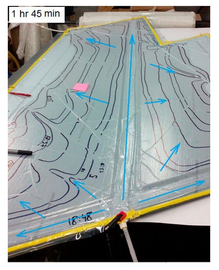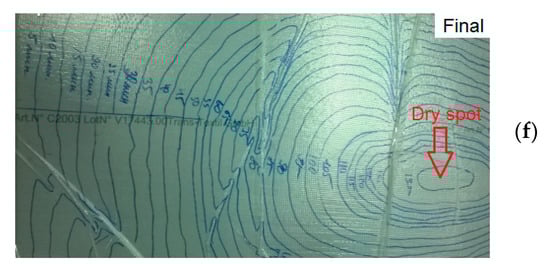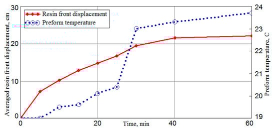 The propagation speed of the resin front began to decline sharply after 40 min from the start of the process. Obviously, this is caused in part by the polymerization reaction of the resin, accompanied by an increment in temperature (see Figure 1), partly by the closure of the resin fronts encountered, as a result of which the conditions for the penetration of vacuum to the dry preform region surrounded by the resin worsened (see Figure 2d). After 2 h and 20 min, the movement of the resin ceased. A gradual decrease in the front velocity in the time interval 0–40 min is in full agreement with the observations [3,8,27,35,39,40].