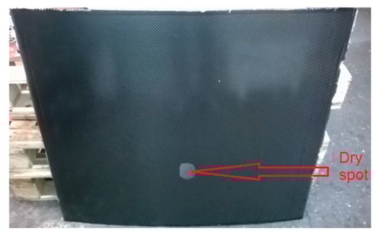 Photograph of the ready infused panel is shown in Figure 3, where the formed dry spot is clearly visible. It arose as a result of the closure of the resin front, called in paper [12] as the inner front, i.e., surrounding the void area with resin in the inner part of the preform.