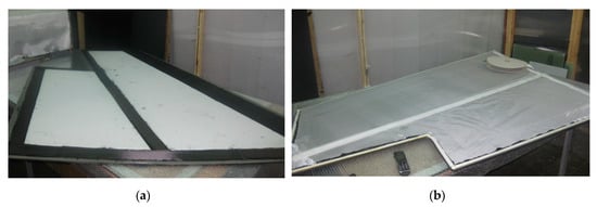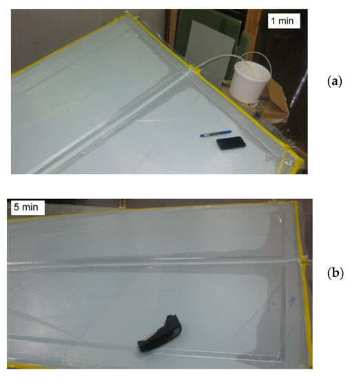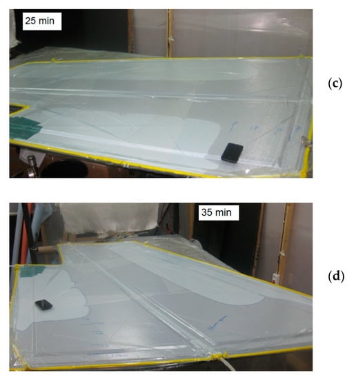 The first thin-walled rectangular panel of dimensions (800 × 700) mm with thickness 1.5 mm was an 8 layered cross-ply symmetric balanced laminate. Laying of HPM, hoses for pumping out the vacuum and resin injection was carried out along three sides around the perimeter of the panel. The vacuum infusion process was carried out at the ambient temperature 19 °C; the averaged preform temperature in the filled region and resin front position recorded every 5 min (see Figure 1). The dynamics of the preform resin infusion is illustrated by a series of photographs in Figure 2.