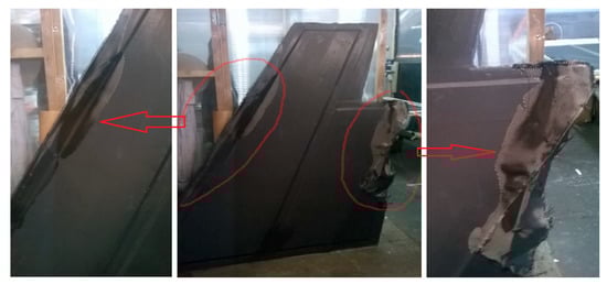 The non-impregnated edges of the cured tail panel in its corners (right) and on the periphery (left). The full view of the ready defective part is shown in the center photo.