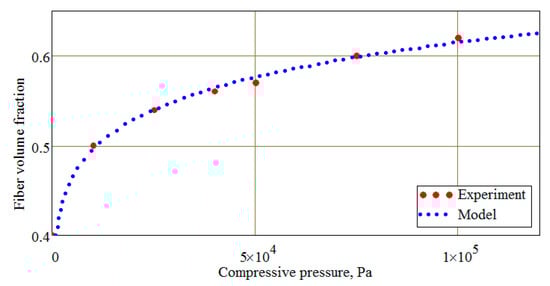 The dependence of the reinforcement volume fraction Vf on the compacting pressure: experimental data borrowed from the article [6] and their approximation by the model in Equation (10) with the parameters: Vf0 = 0.21; B = 0.093.