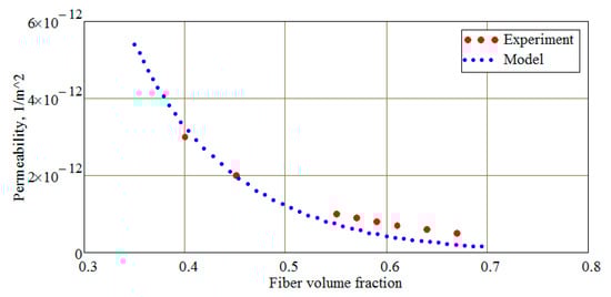 where the Kozeny constant k, determined experimentally, reflects the structure of the porous medium, i.e., depends on the geometry of the reinforcement. Combining Equations (10) and (11), it is easy to obtain the dependence of permeability on compacting pressure. Using the relation between porosity Vϕ and Vf, the dependence of permeability can also be expressed in terms of the porosity